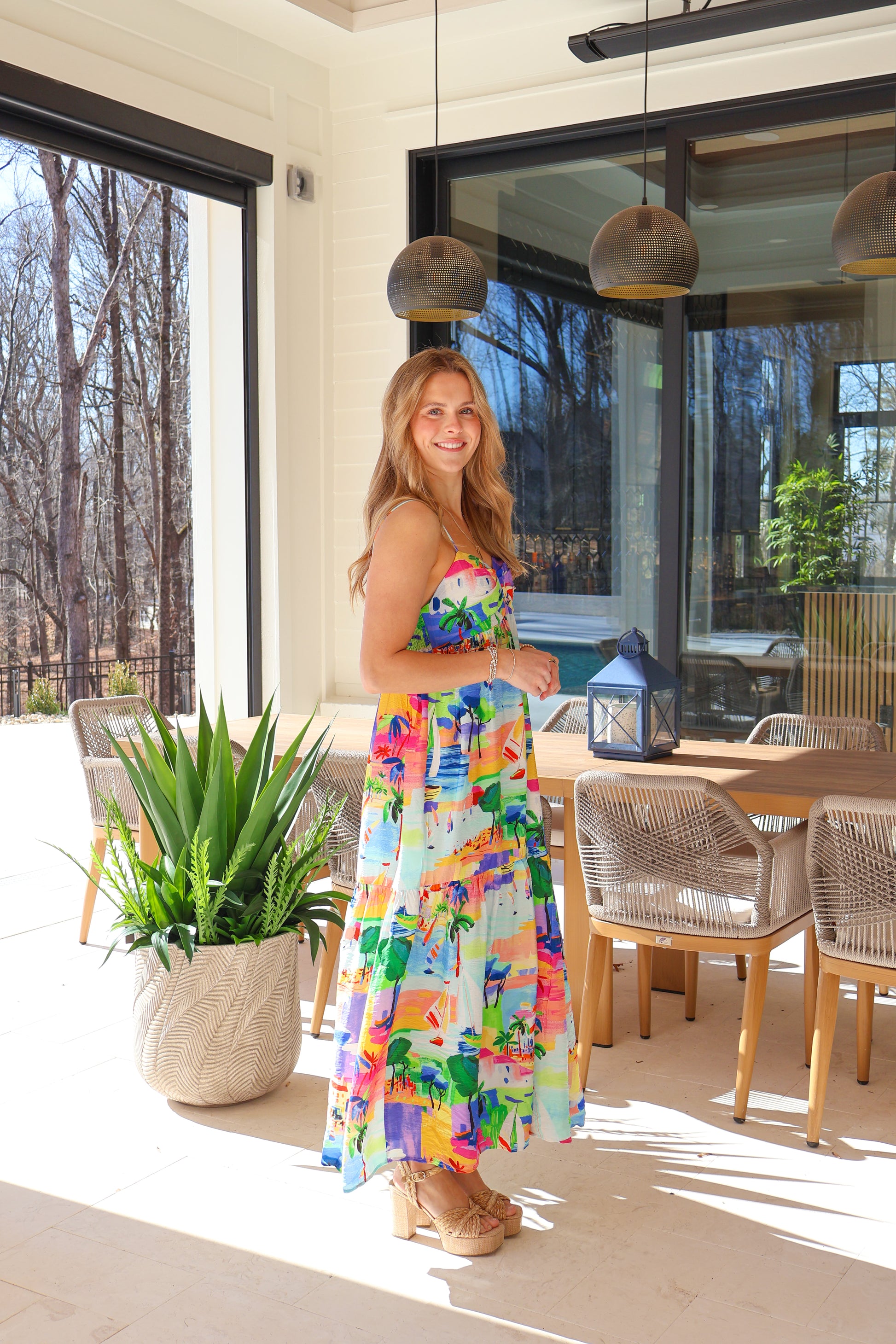 Meet your new summer statement piece! The Beach Party Maxi Dress features a vibrant tropical and boat-inspired print with a breezy tiered silhouette made for sunny days. Designed with adjustable spaghetti straps and a soft sweetheart neckline, this dress flatters effortlessly while the empire waist creates an easy, flowy fit. Finished with a smocked back for comfort and movement, it’s the perfect throw-on-and-go maxi for vacations, brunches, and everything in between.