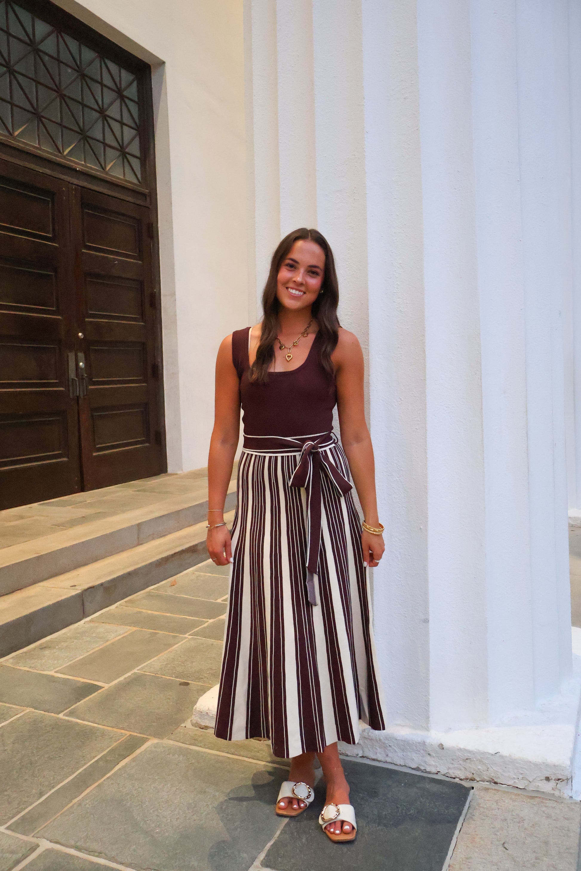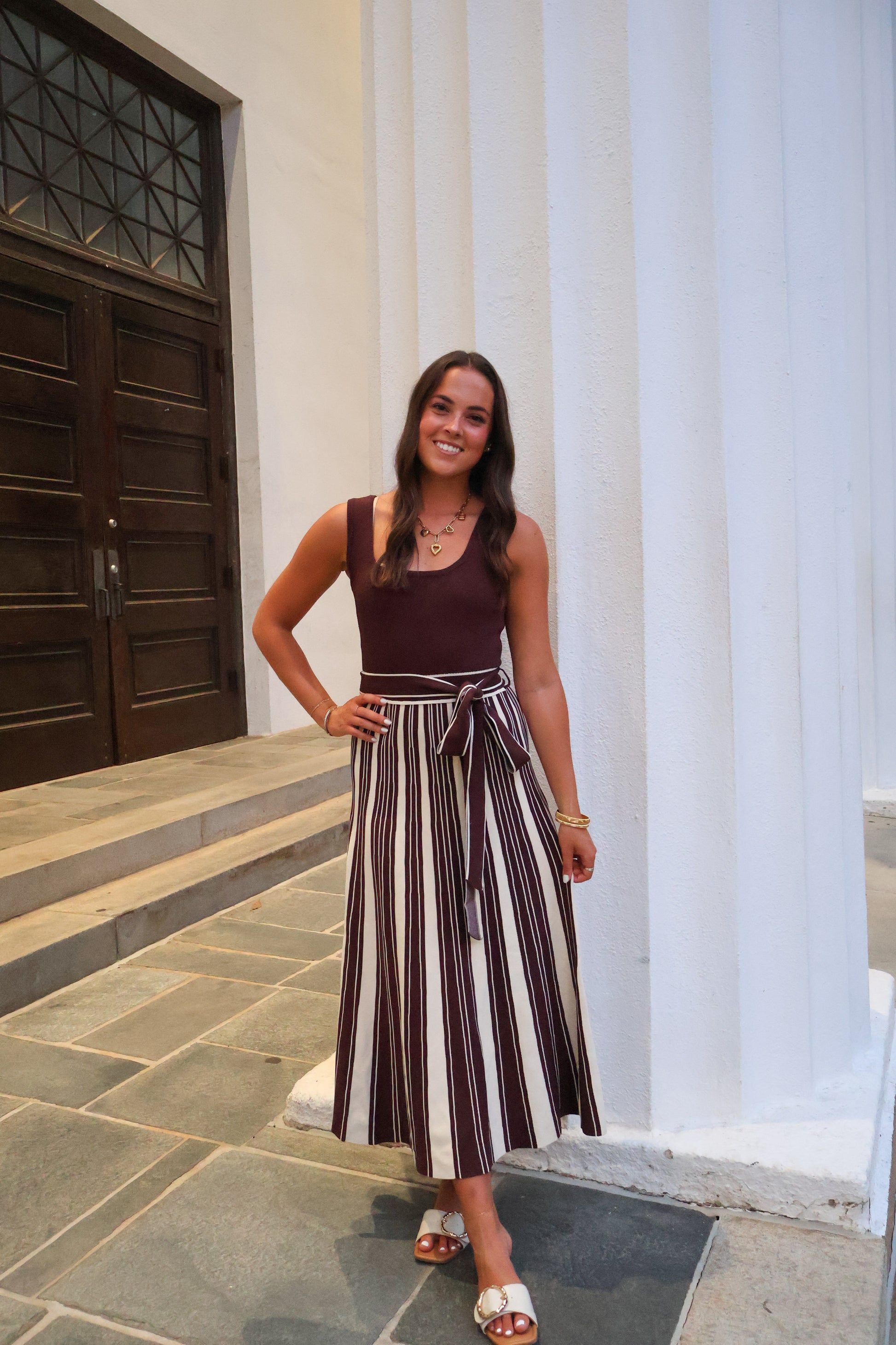 The Camielle Midi Dress is where comfort meets sophistication. Crafted from a thicker sweater-like knit, this sleeveless midi dress features bold mocha and cream vertical stripes designed to elongate and flatter. The self-tie waist cinches perfectly for a feminine silhouette, while the soft yet structured knit makes it an ideal piece for transitioning seasons.