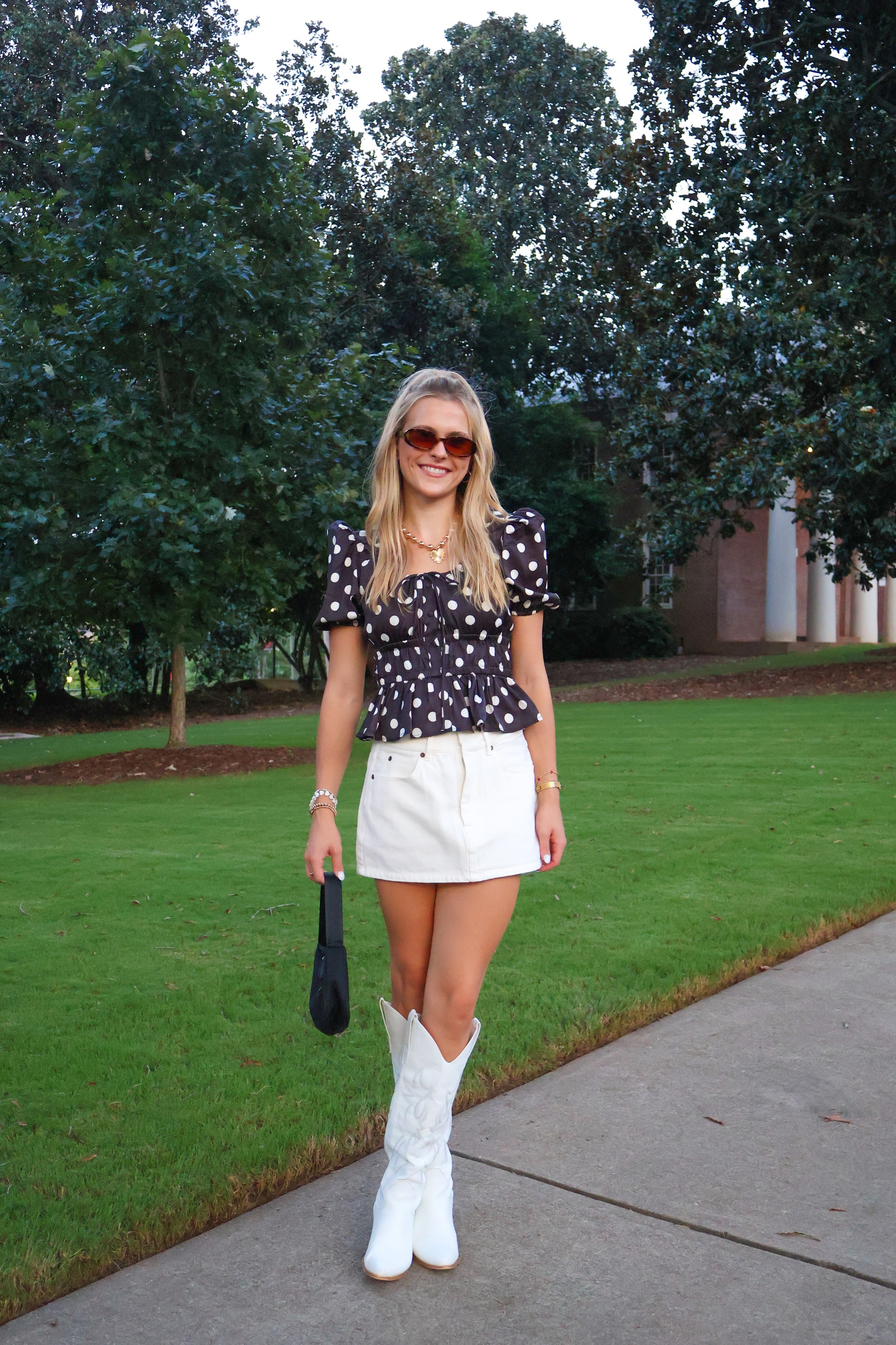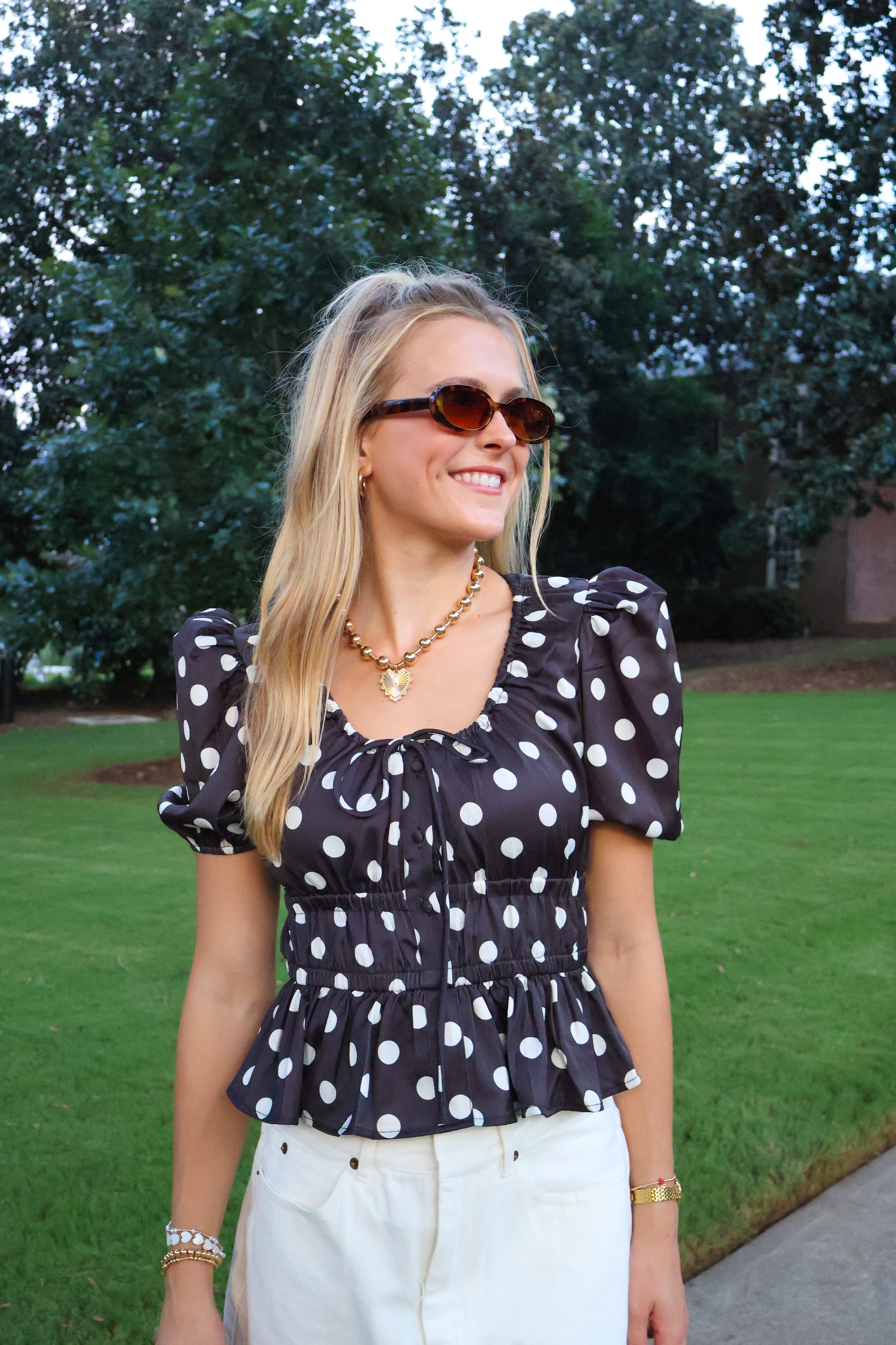 Play up your look with the Dot Game Top, a chic black blouse with bold white polka dots that’s perfect for game day or a night out. Designed with puff sleeves, a flattering drawstring neckline, and a cinched waist that flows into a flirty peplum hem, this top blends feminine charm with a playful twist.