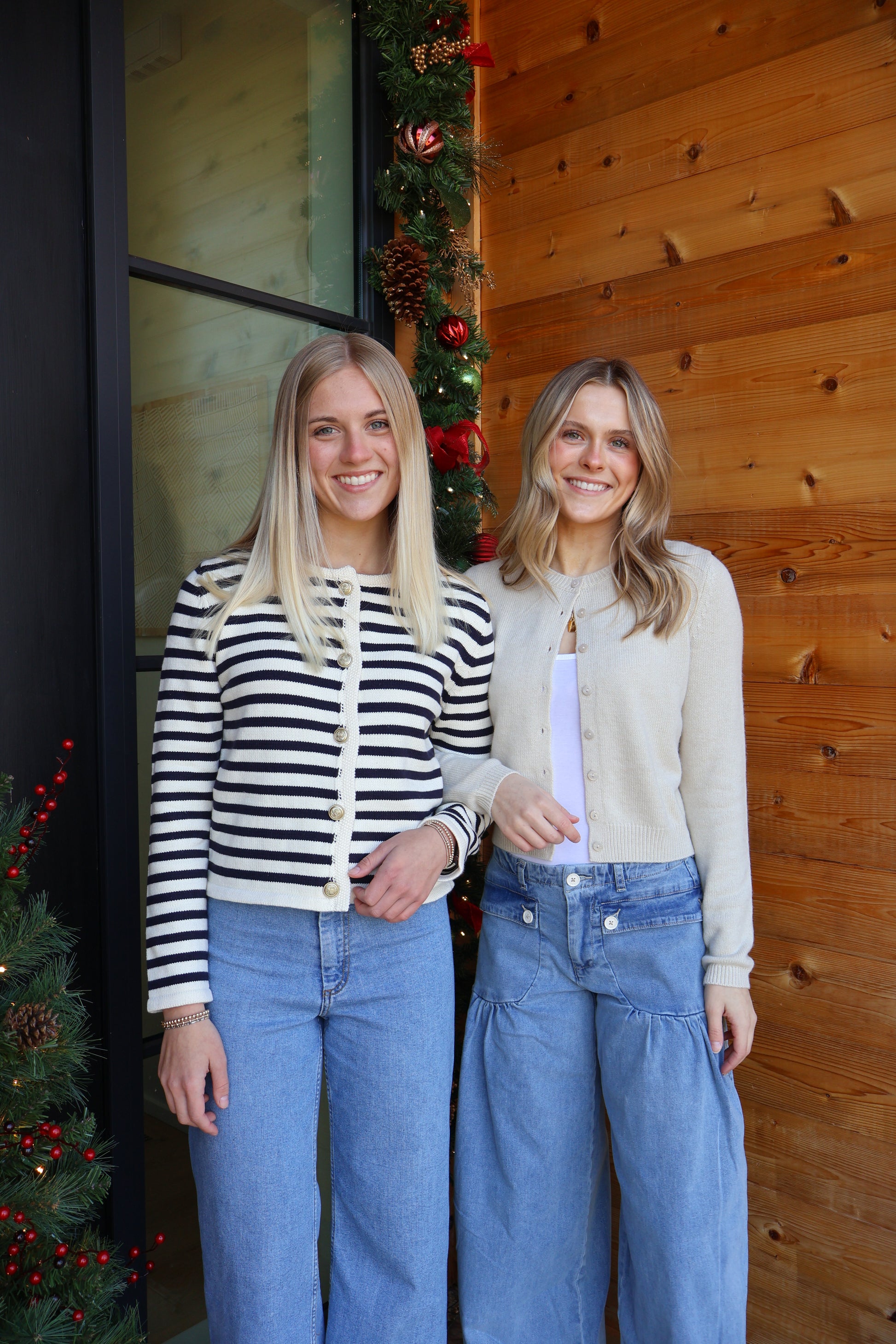 Introducing our 'Juliet Cardigan'—the perfect blend of cozy comfort and chic sophistication! 🤍 This striped cardigan, crafted in soft cotton boucle, features a sleek slim fit and a versatile cropped length that pairs effortlessly with high-waisted jeans or skirts. The contrast band detail and elegant gold buttons elevate the look, adding a touch of glam to this timeless piece.