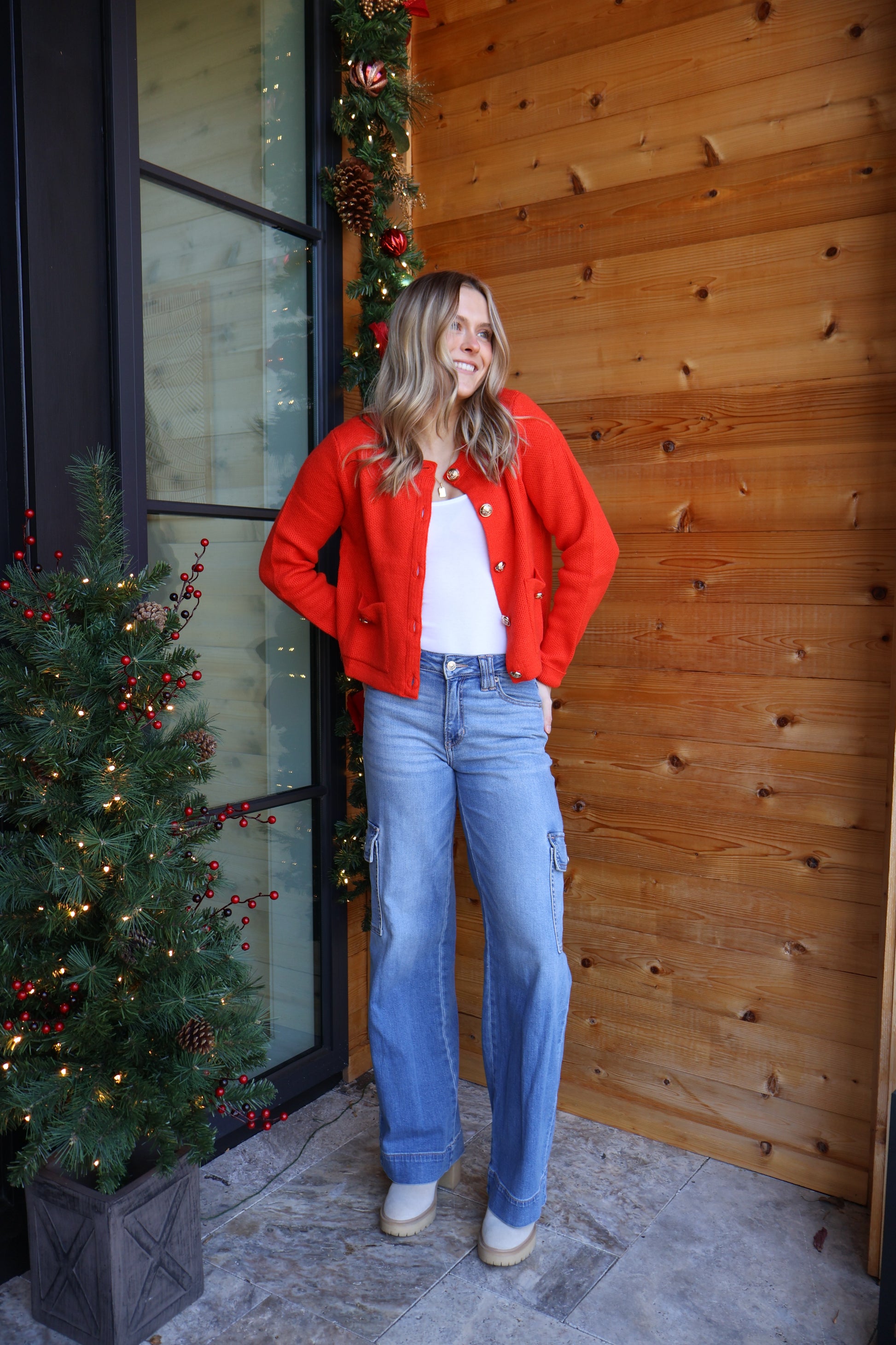 Introducing our 'Missy Cardigan' in Tomato—a bold and vibrant addition to your wardrobe! This stunning cardigan features chic gold buttons for a touch of elegance and functional front pockets for added style and convenience. Its relaxed fit and flattering silhouette make it the perfect piece to layer over your favorite outfits, whether you’re dressing up or keeping it casual.