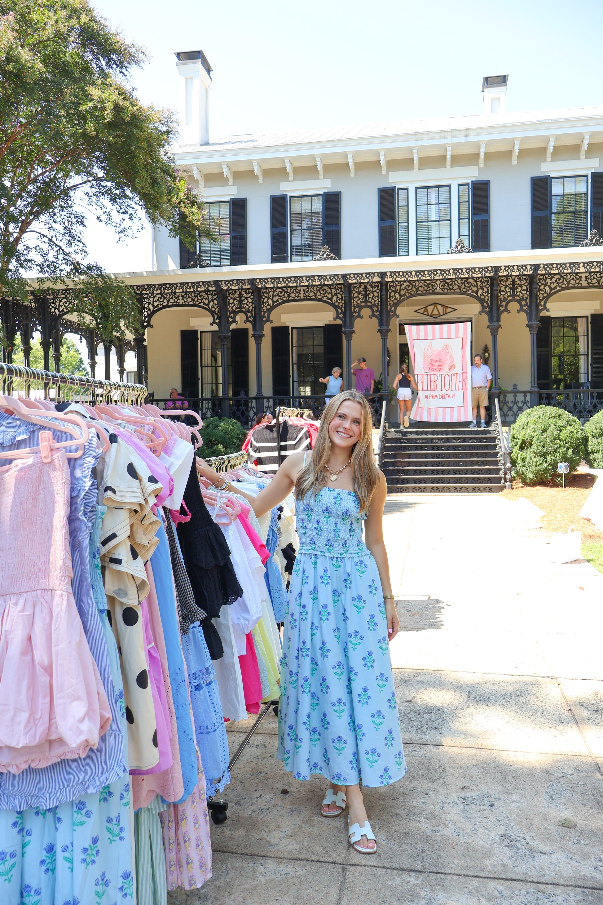 This sleeveless midi dress features a smocked bodice with a subtle square neckline and adjustable spaghetti straps for a comfortable, flattering fit. The lightweight fabric falls into a flowy skirt that moves effortlessly, finished with an allover floral print in soft blue and green tones. Perfect for warm-weather days, this dress balances ease and elegance—ideal for brunch, strolls, or summer events.