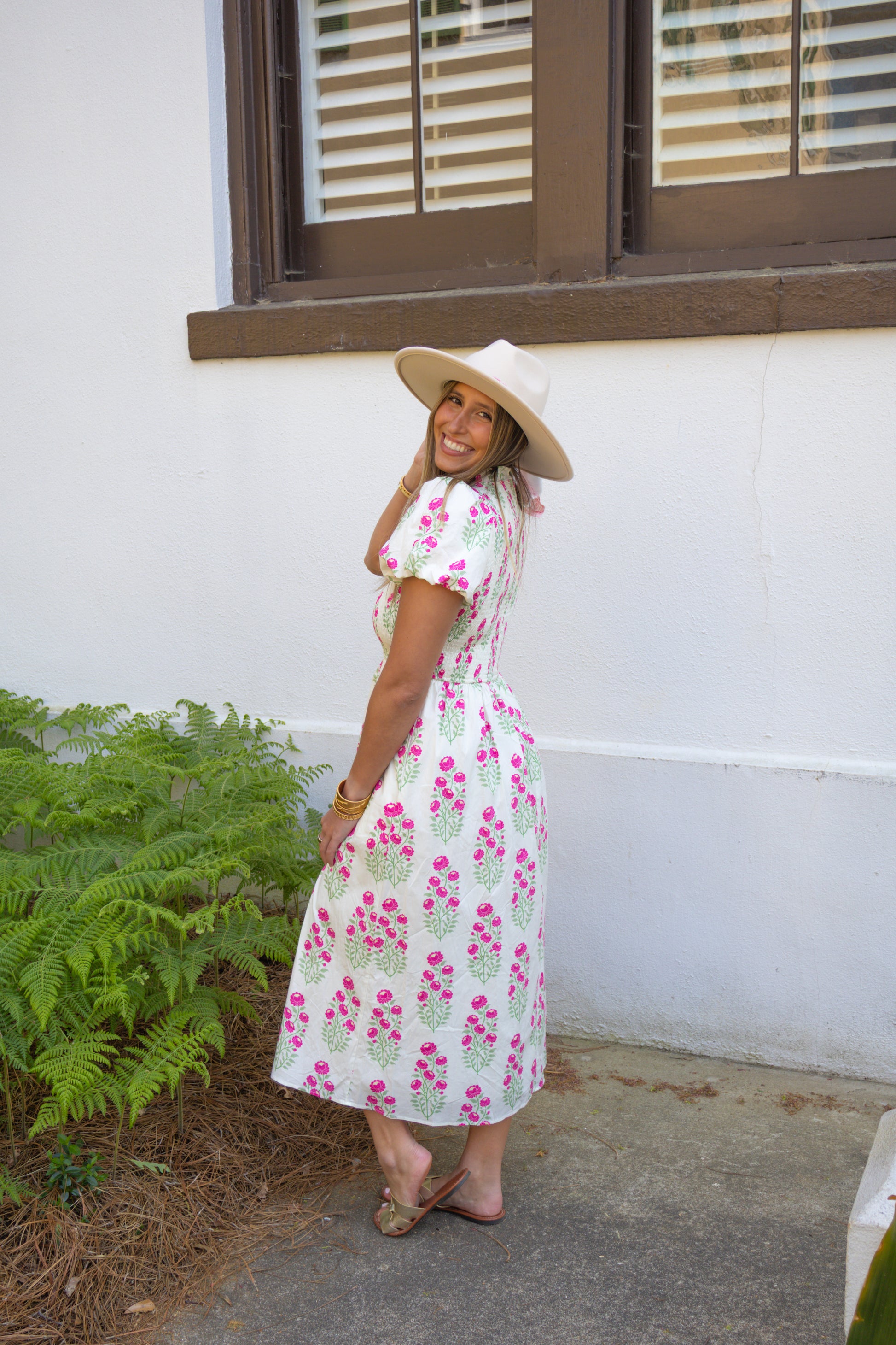 The Annalise Midi Dress features a fitted bodice, short puff sleeves, and a midi length skirt with soft movement throughout. The pink floral print stands out against the light background, giving it a classic spring look that works well for church, brunch, showers, or daytime events.