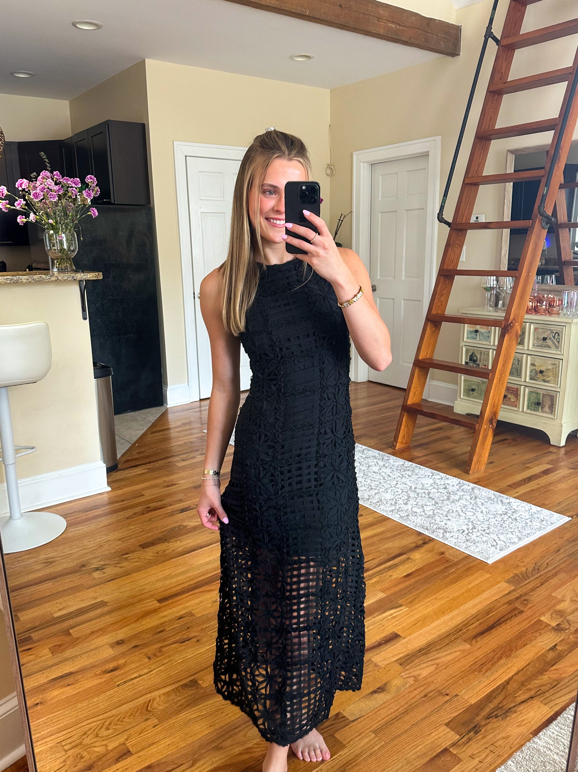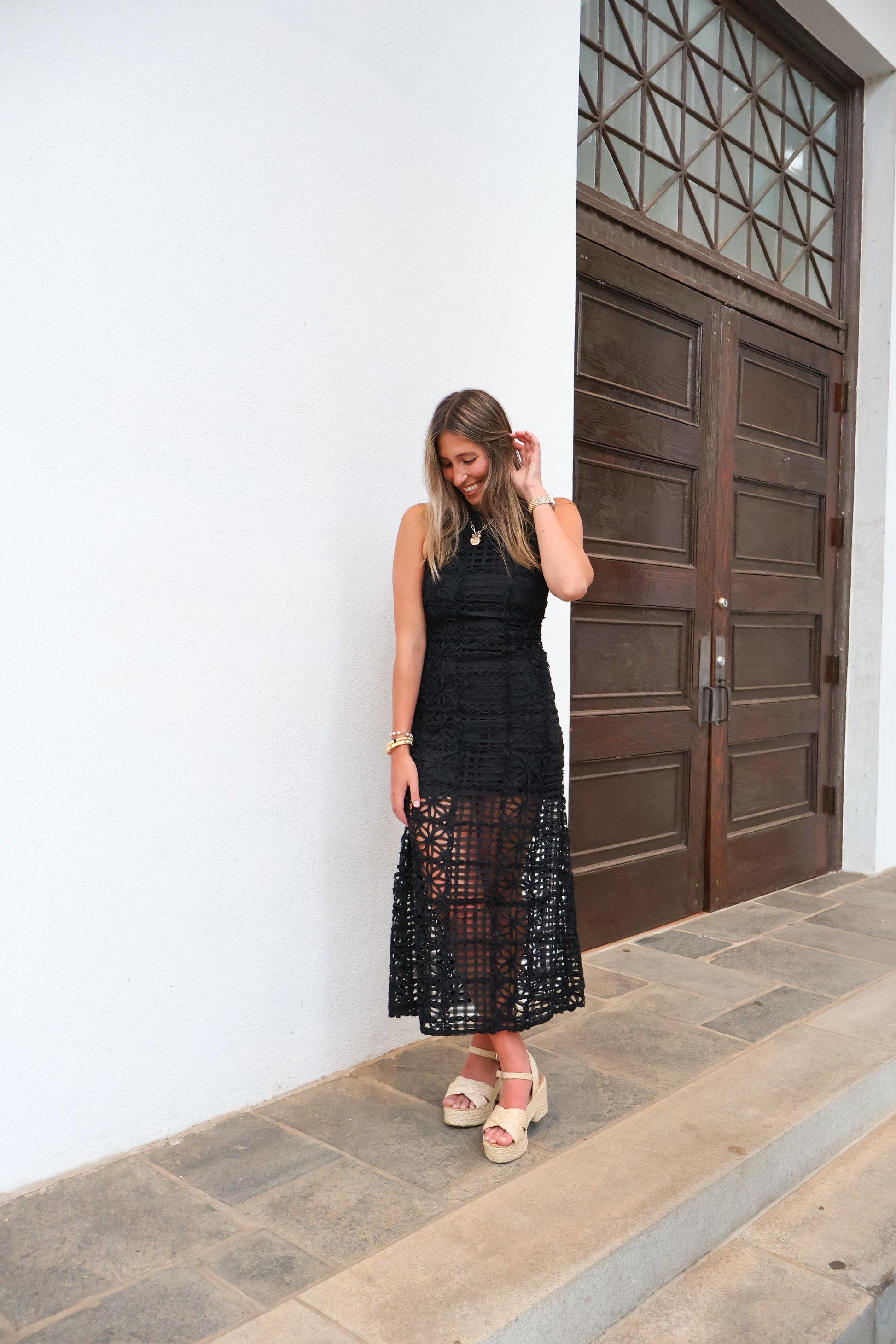 The Aurelia Midi Dress is the definition of elevated elegance. Crafted from intricate black lace, this sleeveless midi features a fitted bodice and a sheer lace skirt overlay that creates a striking silhouette. Designed for special occasions, the Aurelia is a statement piece that blends sophistication with allure.
