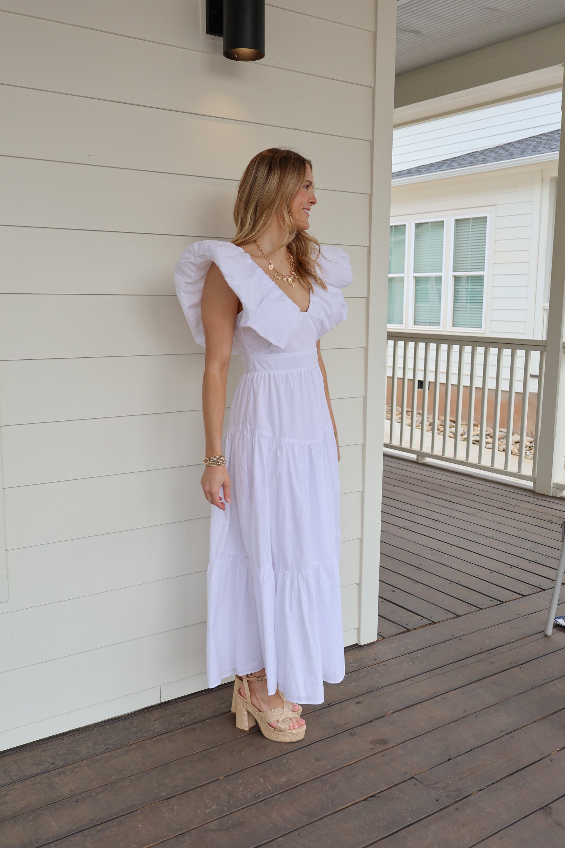 The Bianca Maxi is a statement piece for any occasion. Featuring dramatic ruffled sleeves, a deep V-neckline, and a tiered skirt, this dress blends bold and feminine elements effortlessly. The back zipper ensures a secure fit, while the crisp white fabric adds sophistication—perfect for bridal events, garden parties, or summer events.