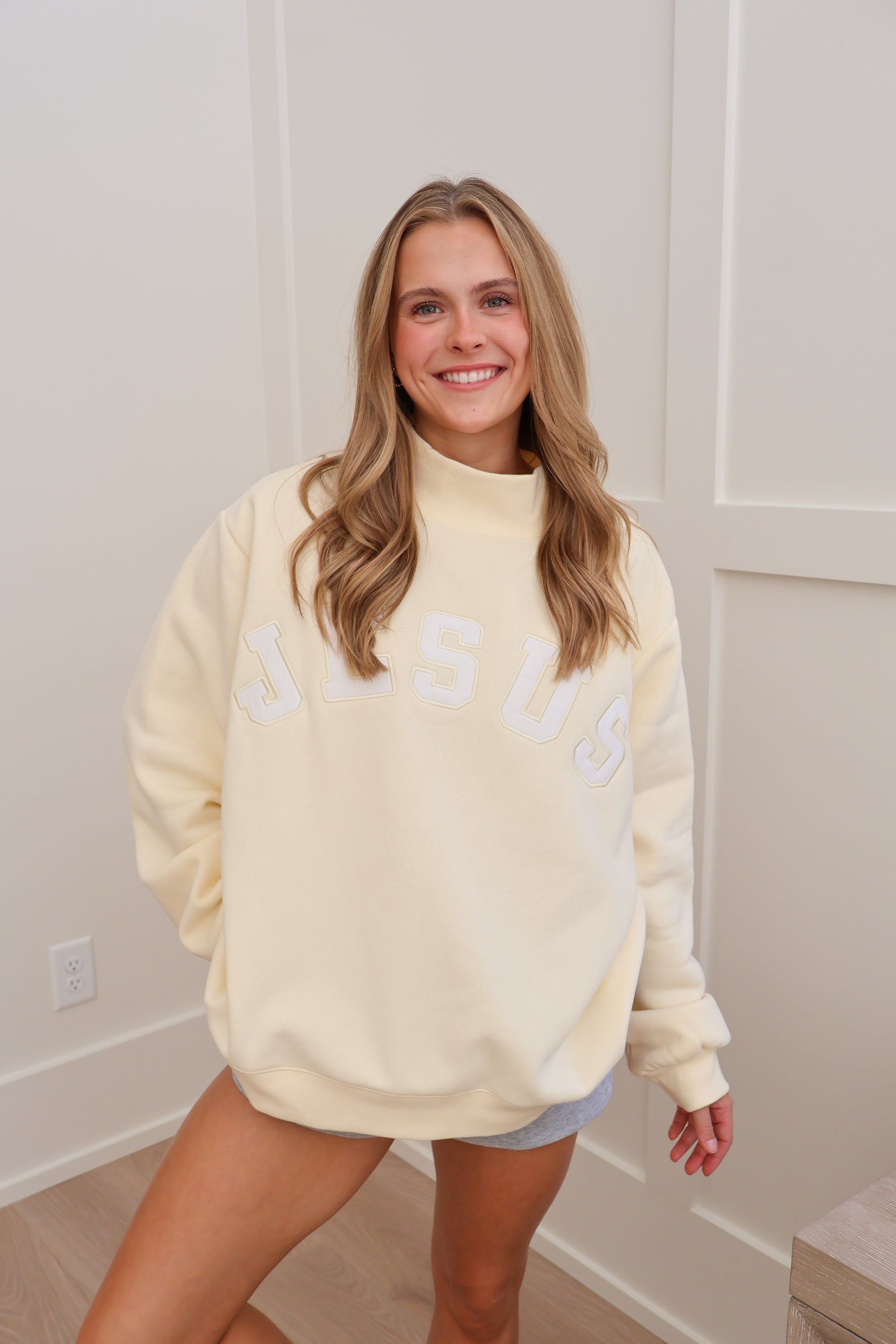 The “JESUS” Mockneck in Butter Yellow radiates warmth, joy, and quiet strength. Made with ultra-soft fleece and a relaxed silhouette, this Long Weekend exclusive combines everyday comfort with an elevated edge. The soft yellow hue and clean varsity embroidery make it a piece that’s effortlessly meaningful — and beautifully timeless.