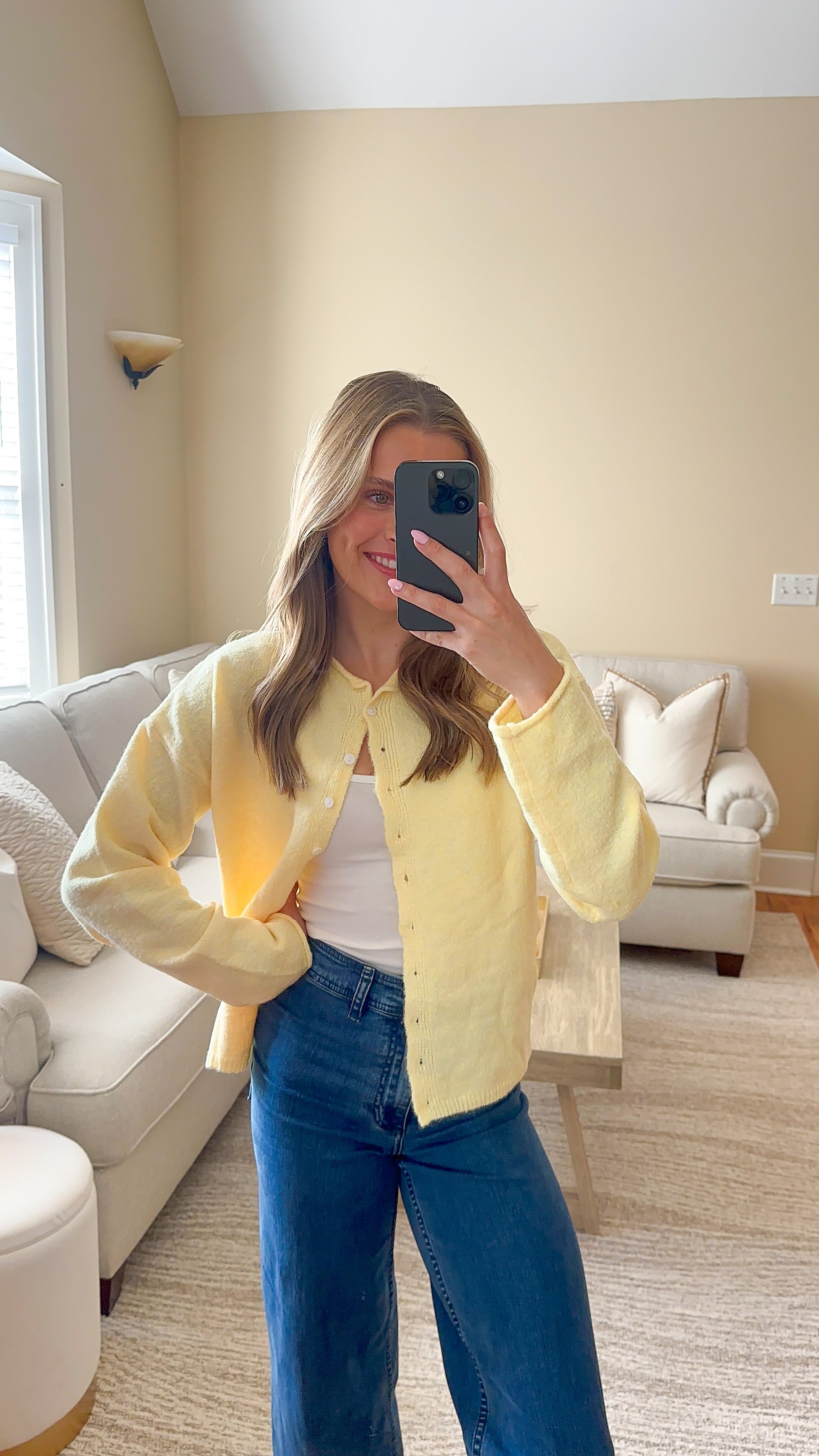 Add a touch of sunshine to your wardrobe with the Marigold Cardigan, a soft butter yellow knit that’s perfect for layering. Designed with a classic button-front and relaxed fit, this cardigan pairs effortlessly with denim, skirts, or dresses. Lightweight yet cozy, it’s the ideal transitional piece for spring, cool summer nights, or fall layering.